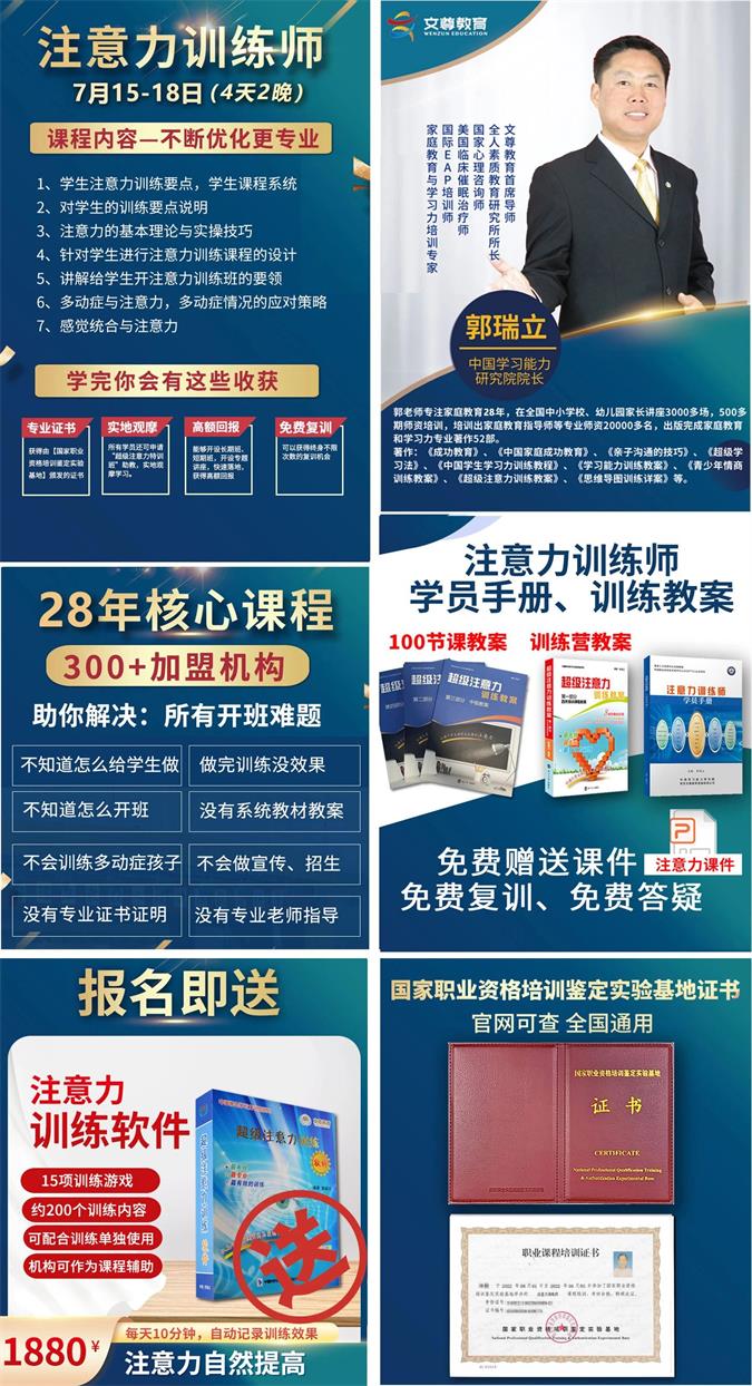 注意力是最基本的学习能力,是记忆、理解、观察、思维的必备能力,没有注意力就没有学习。注意力训练一定要用科学的方法。文尊教育郭瑞立教授团队19年来,在对学生进行注意力实际培训和指导基础上,提炼出来的一套系统的注意力训练师课程,既有专业的理论,又有具体的训练方法,具有极强的操作性。文尊【注意力训练师】课程,为你拨开注意力训...