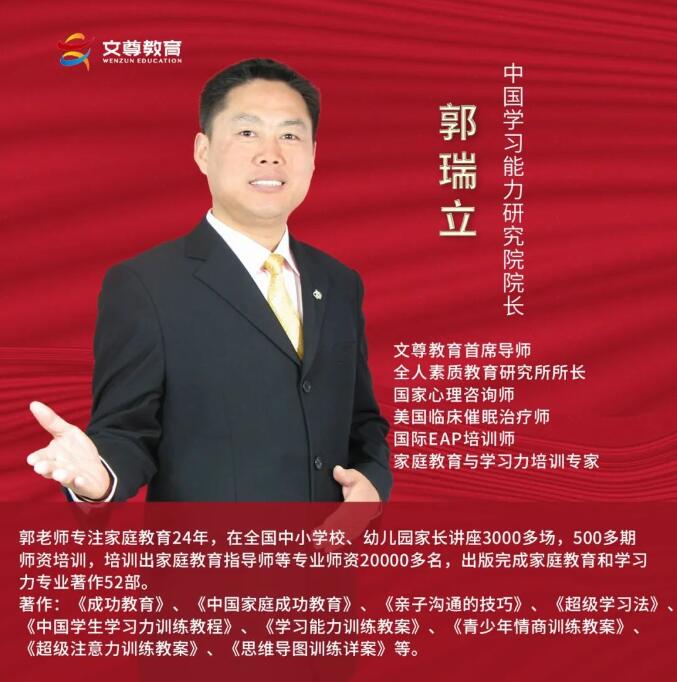 主讲导师郭瑞立老师是中国专业的家庭教育专家,也是中小学生学习能力实际训练的专家,从1998年开始从事家庭教育,已经传播家庭教育研究25年,在全国中小学校、幼儿园开展现场家长讲座3000多场,从2003年开始,已为中小学生培训学习方法500多期。出版家庭教育和学习力专业著作52部。著作有《成功教育》、《中国家庭成功教育》、《家庭教育指导》《亲子沟通的技巧》、《超级学习法》、《超级学习法训练》、《超级记忆法训练》、《中国学生学习力训练教程》、《学习能力训练教案》、《青少年情商训练教案》、《超级注意力训练教案》、《思维导图训练详案》等。为了更好教育自己孩子的父母,为了更好教育子孙的长辈。